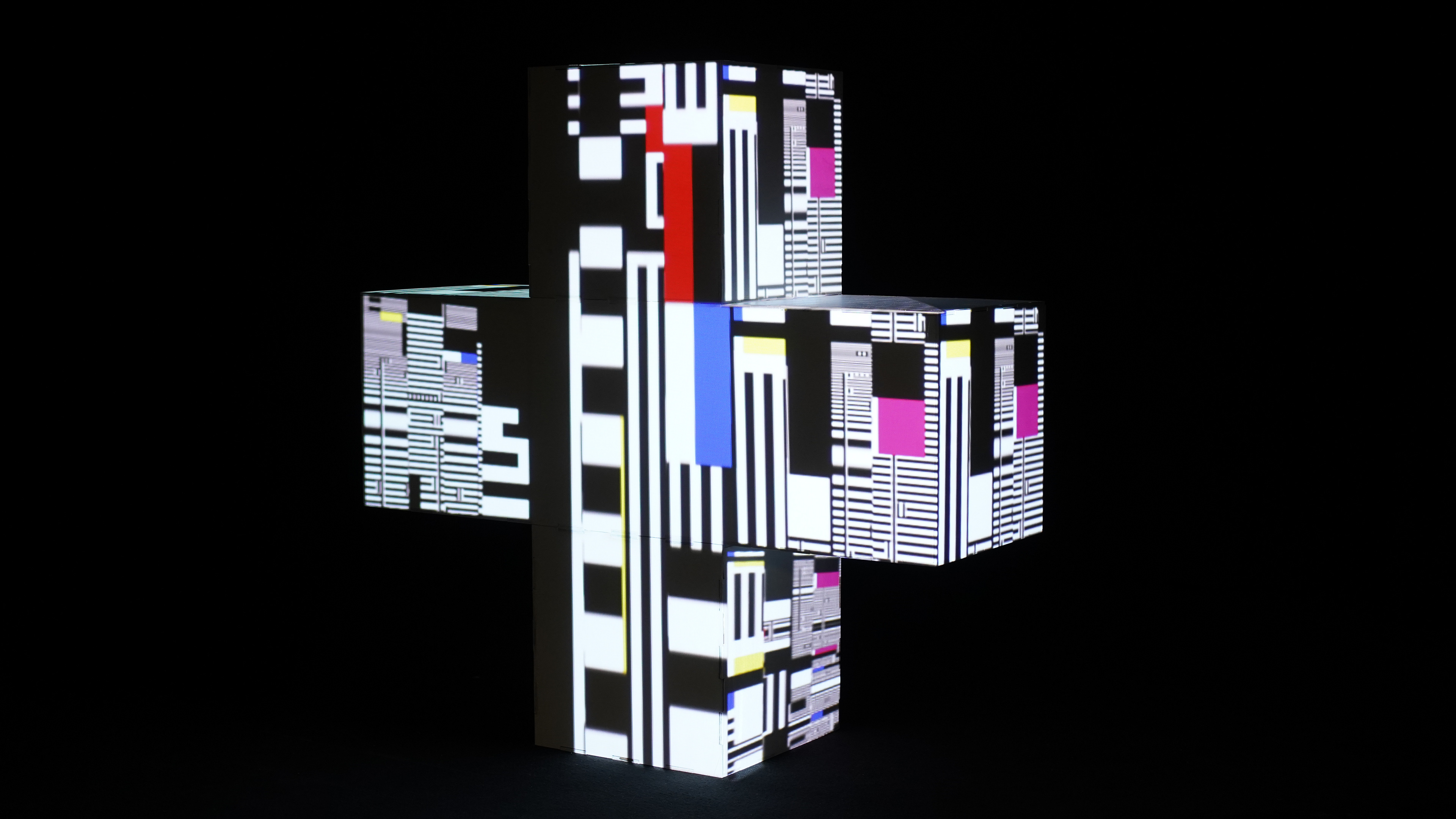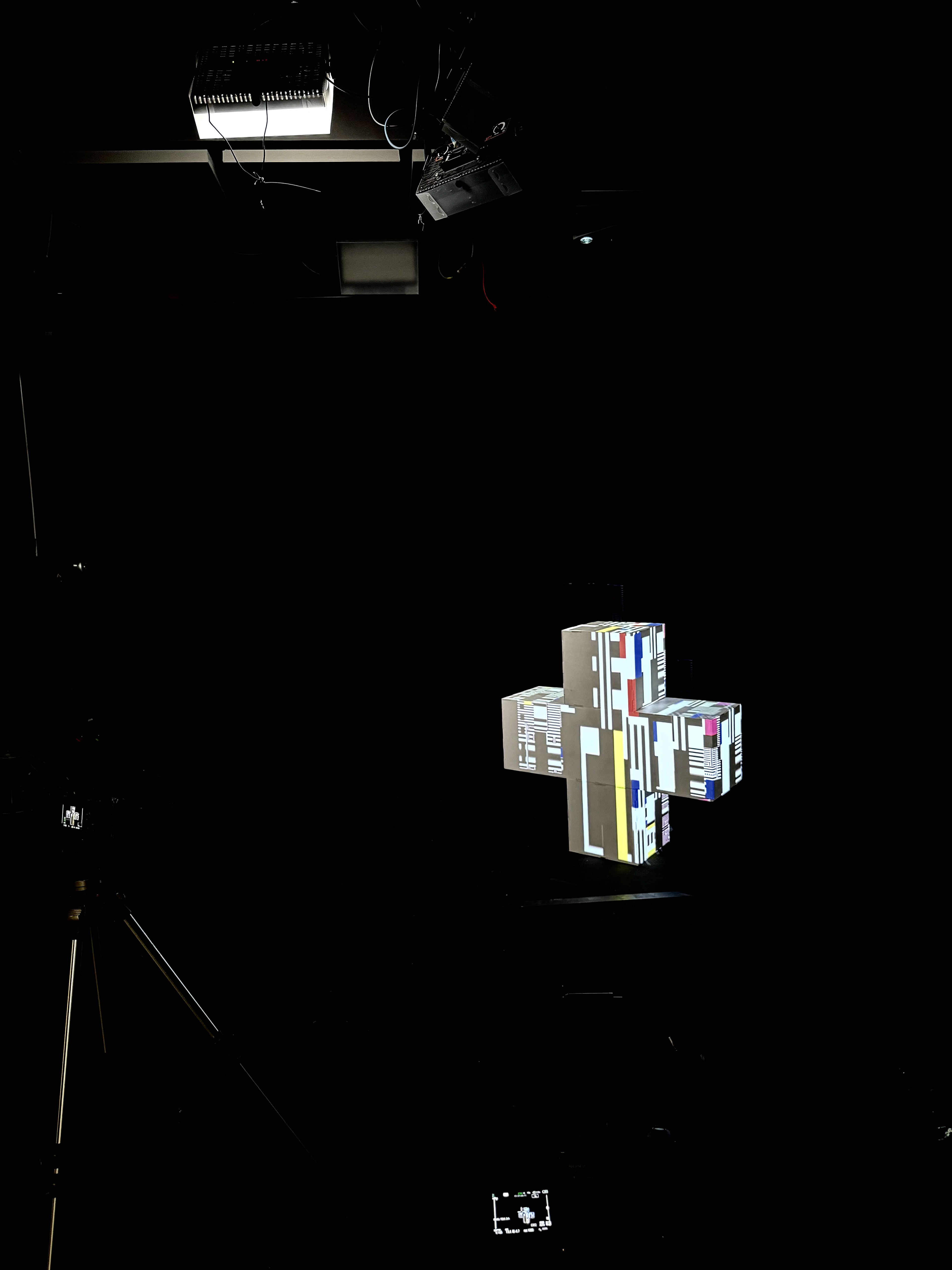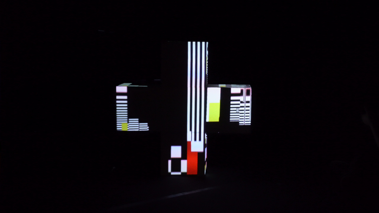 Mapping vidéo interactif réalisé avec TouchDesigner sur une croix sculpturale de 1 m × 1 m, d’une profondeur de 33 cm. La projection investit la majorité des faces, transformant l’objet en un volume lumineux et dynamique. Réalisée au sein du collectif IXIO, l’oeuvre intègre un capteur de télémétrie laser permettant une interaction en temps réel : la présence du spectateur influence à la fois le son et le mouvement des images, créant une expérience immersive et sensible.